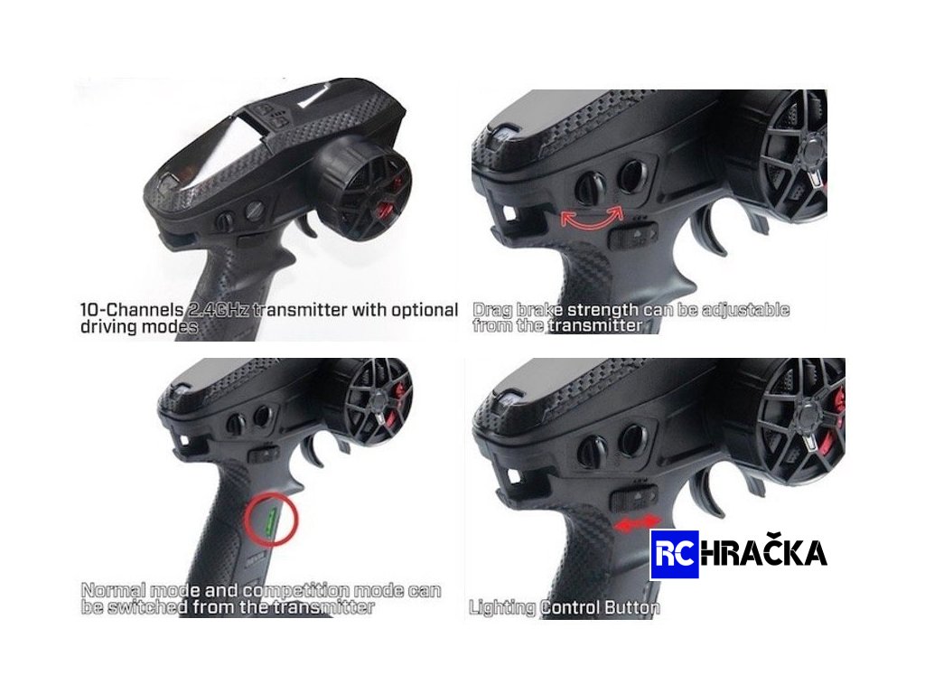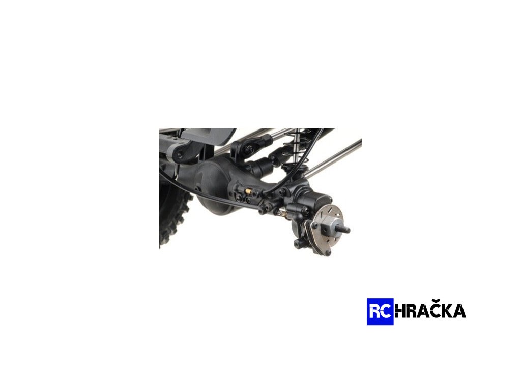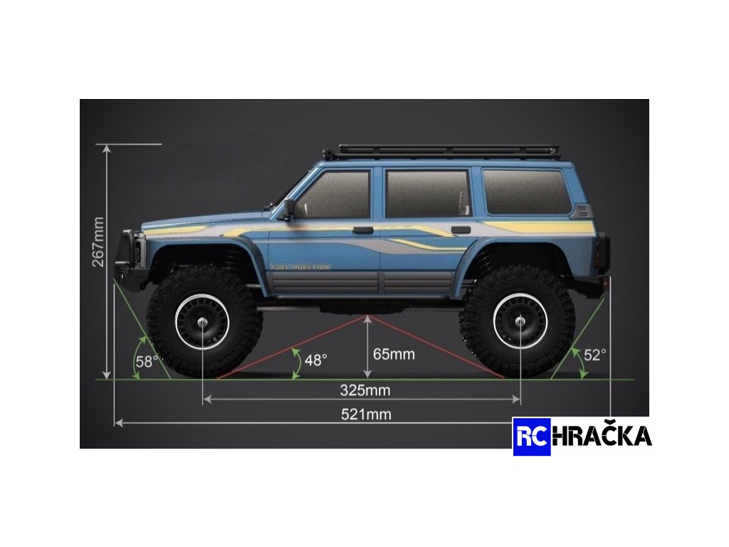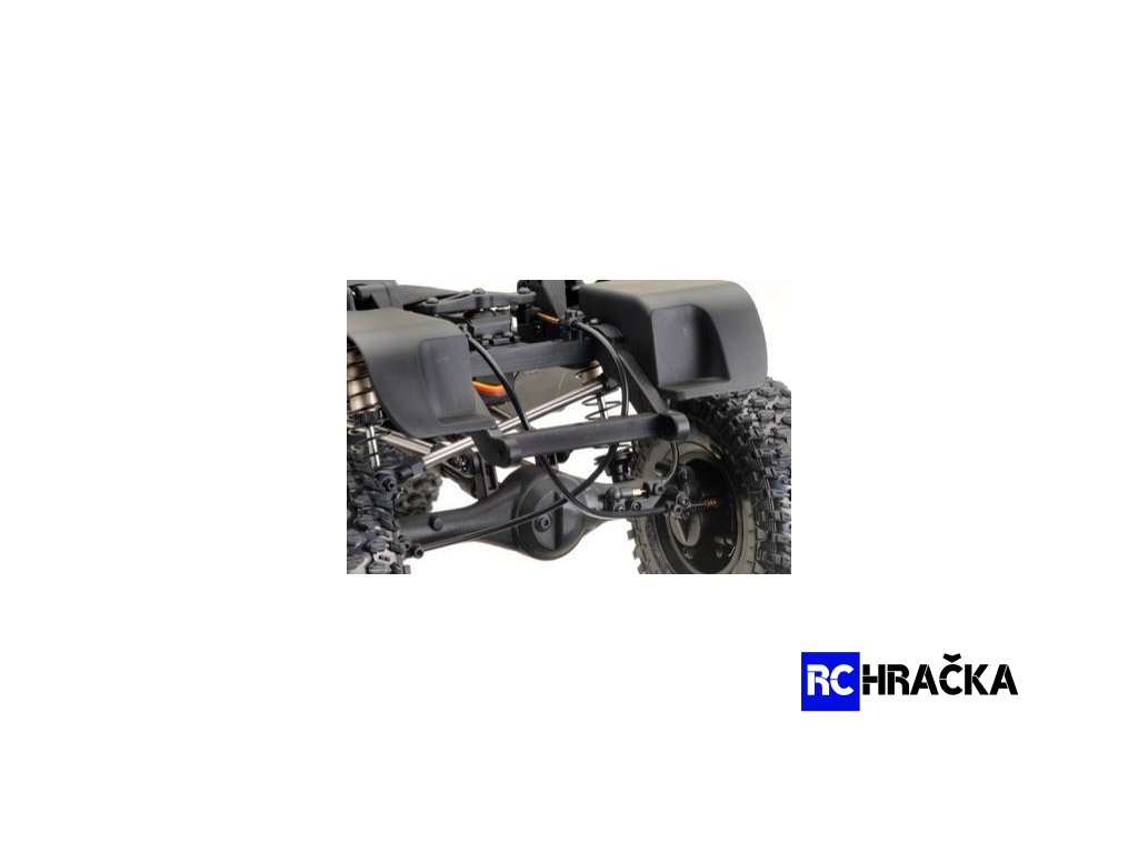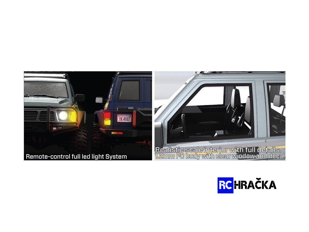 Nová generace expedičního speciálu Absima na podvozku CR4.4 1:10 s excelentními jízdními vlastnostmi. Model má pohon všech kol, je vybaven portálovými nápravami pro maximální průjezdnost terénem. Podvozek má díky novému umístění motru, převodovky a baterie velmi nízké těžiště, což výrazným způsobem vylepšuje jízdní vlastnosti. Dvoustupňová převodovka, uzávěrky diferenciálů, nainstalované LED osvětlení - vše je ovládané z desetikanálového vysílače a ještě vám zůstanou volné kanály na ovládání případných dalších funkcí (naviják, majáky a pod.). Pevný plastový rám s rozvorem 325mm je vybaven plastovými podběhy, které výrazně omezují pronikání nečistot na šasi. Nápravy jsou zavěšené na klasickém 4-linku (kovové linky). Poloosy jsou vybaveny odolnými U klouby, přední kola mají úhel zatočení 45° na každou stranu. Měkké pneumatiky s velkým gripem jsou nalepené na 2.2 plastových diskách. Tlumiče jsou olejové, kovové. Všechny převody jsou kovové (kromě velkého převodového kola u pastorku) a komplet zakrytované. Pastorek s převodovým kolem mají modul M0,6. Silné servo řízení s tahem 25kg s kovovými převody ovládá přední kola přes účinný tlumič řízení, toto řešení výrazně prodlužuje životnost serva a snižuje nároky na jeho výkon (tah). Elektromotor je stejnosměrný typ 550 s velkým točivým momentem. Regulátor je samostatný - Hobbywing WP-1060 60A, BEC 6V/3A. Konektor na regulátoru je D-Dean. Karosérie je vybavena mnoha maketovými doplňky. Specialitou tohoto modelu je funkce DIG, která při zatáčení v náročném terénu může mechanicky uzavírat/brzdit zadní nápravu a tím výrazně zmenšovat poloměr zatáčení. Na rozdíl od běžných systémů DIG zde nebrzdí obě zadní kola, ale pouze jedno ve vnitřku zatáčky a tím dokáže ještě více snížit poloměr zatáčení a zvýšit manévrovací schopnosti modelu na omezeném prostoru.