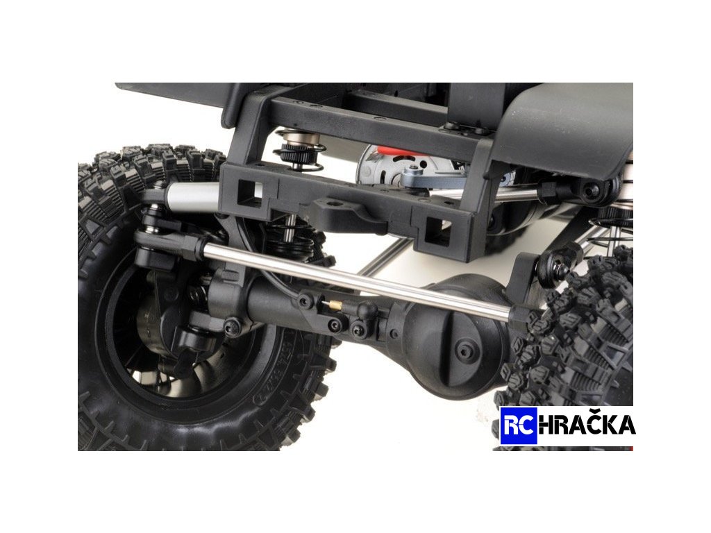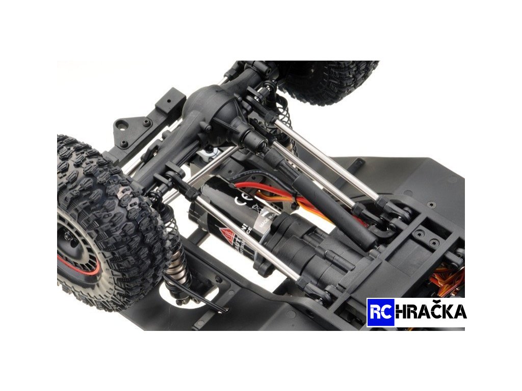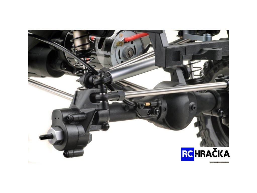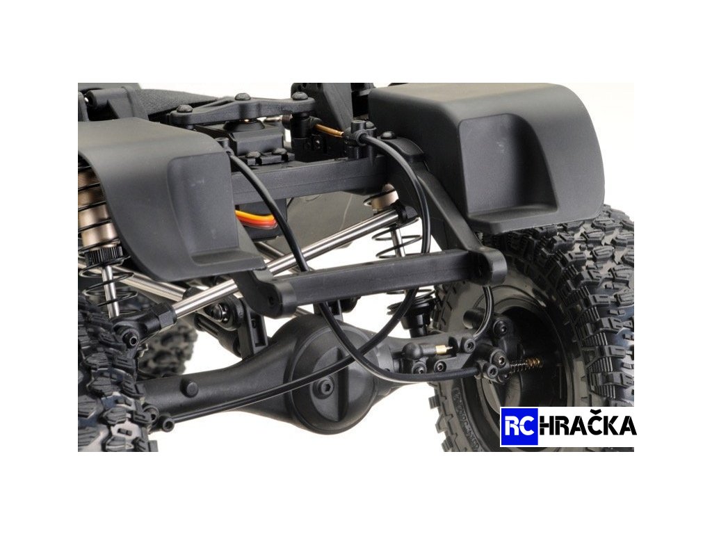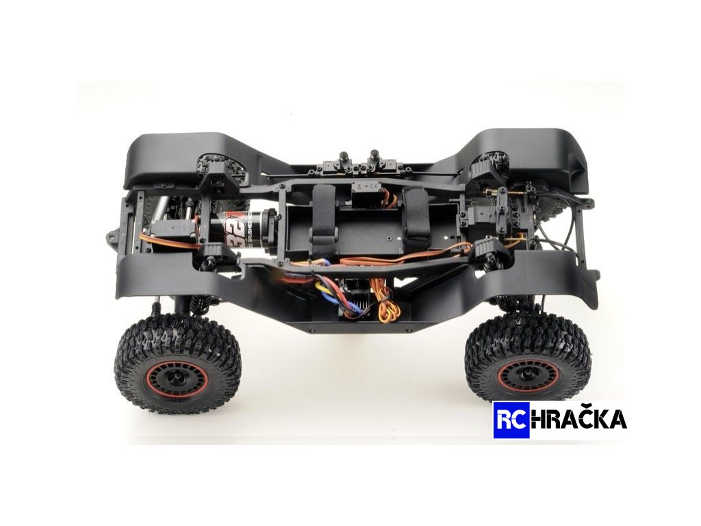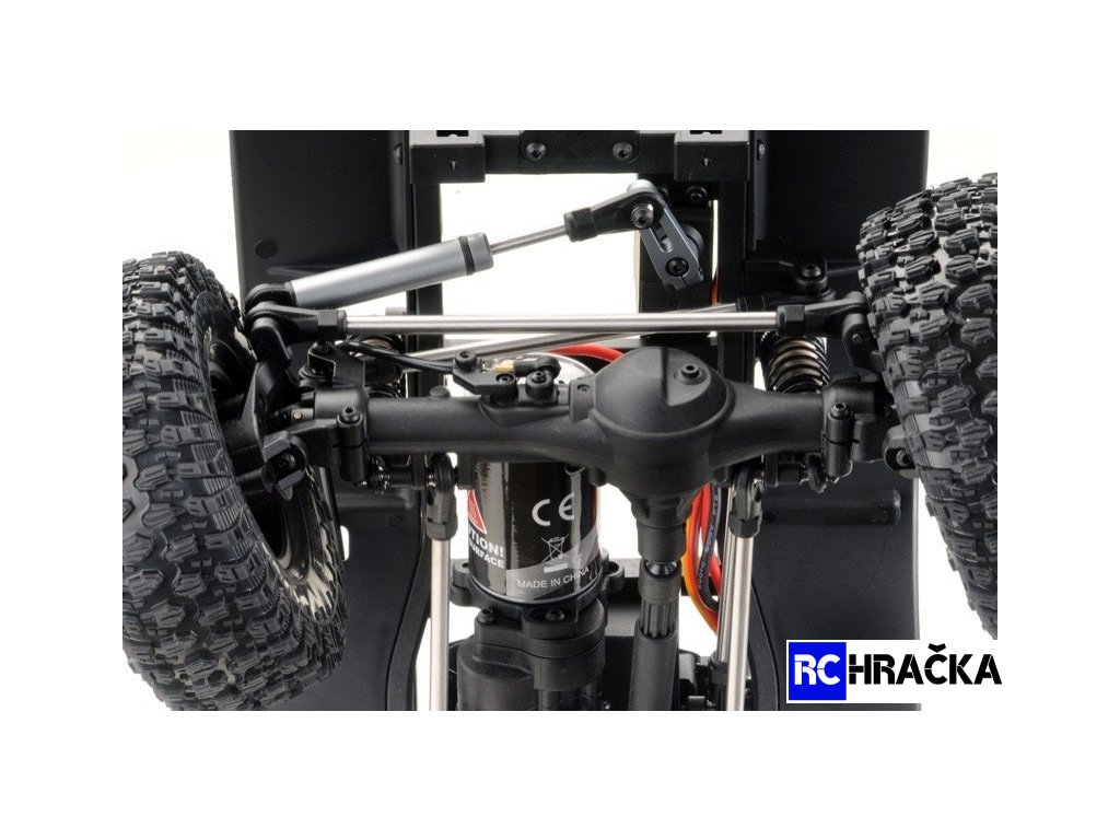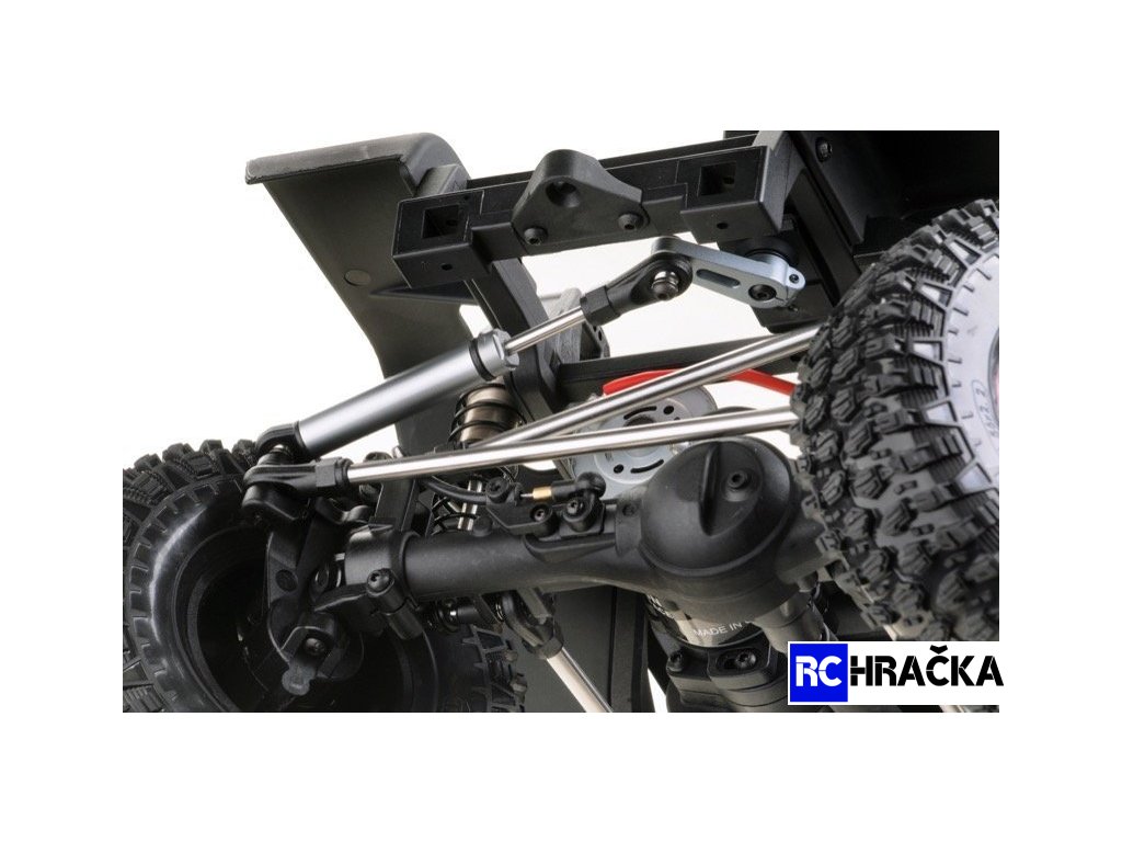 Nová generace expedičního speciálu Absima 1:10 s excelentními jízdními vlastnostmi. Model má pohon všech kol, je vybaven portálovými nápravami pro maximální průjezdnost terénem. Podvozek má díky novému umístění motru, převodovky a baterie velmi nízké těžiště, což výrazným způsobem vylepšuje jízdní vlastnosti. Dvoustupňová převodovka, uzávěrky diferenciálů, nainstalované LED osvětlení - vše je ovládané z jedenáctikanálového vysílače a ještě vám zůstanou volné kanály na ovládání případných dalších funkcí (naviják, majáky a pod.). Pevný plastový rám s rozvorem 325mm je vybaven plastovými podběhy, které výrazně omezují pronikání nečistot na šasi. Nápravy jsou zavěšené na klasickém 4-linku (kovové linky). Poloosy jsou vybaveny CVD klouby, přední kola mají úhel zatočení 45° na každou stranu. Měkké pneumatiky s velkým gripem jsou nalepené na 2.2 plastových diskách. Tlumiče jsou olejové, kovové. Všechny převody jsou kovové (kromě velkého převodového kola u pastorku) a komplet zakrytované. Pastorek s převodovým kolem mají modul 32dp. Silné servo řízení s tahem 25kg s kovovými převody ovládá přední kola přes účinný tlumič řízení, toto řešení výrazně prodlužuje životnost serva a snižuje nároky na jeho výkon (tah). Elektromotor je stejnosměrný typ 550 s velkým točivým momentem. Regulátor je integrovaný v přijímači, možné zatížení je až 60A, výkonný BEC 5A. Konektor na regulátoru je D-Dean. Karosérie je vybavena mnoha maketovými doplňky. Specialitou tohoto modelu je funkce DIG, která při zatáčení v náročném terénu může mechanicky uzavírat/brzdit zadní nápravu a tím výrazně zmenšovat poloměr zatáčení. Na rozdíl od běžných systémů DIG zde nebrzdí obě zadní kola, ale pouze jedno ve vnitřku zatáčky a tím dokáže ještě více snížit poloměr zatáčení a zvýšit manévrovací schopnosti modelu na omezeném prostoru.