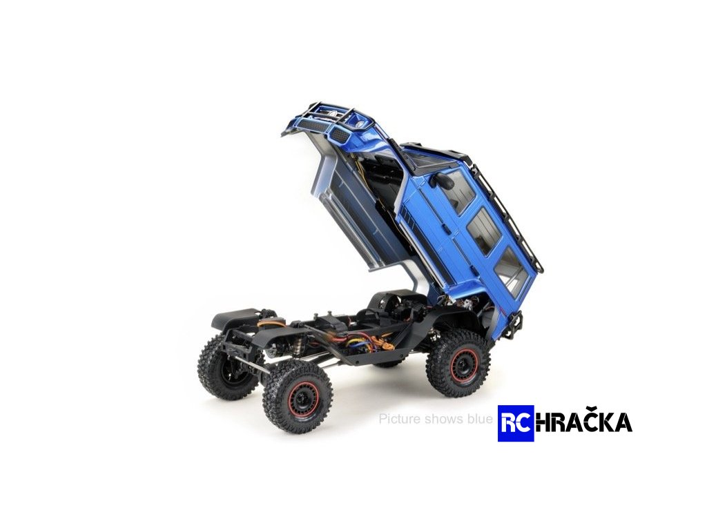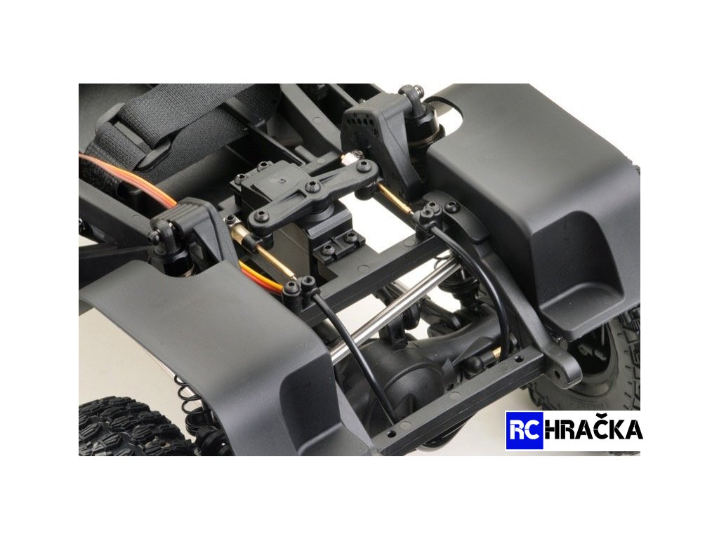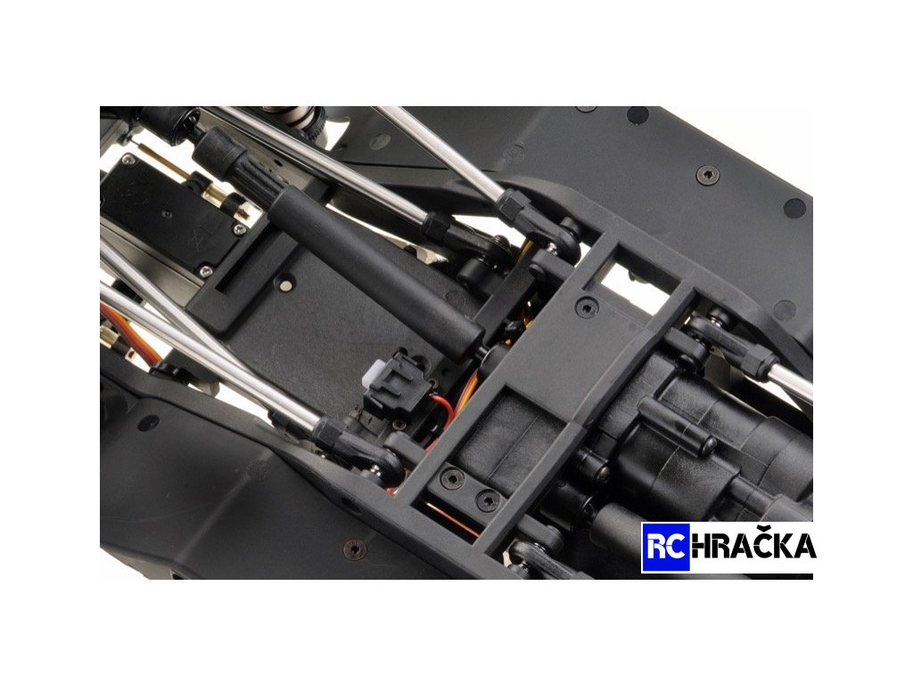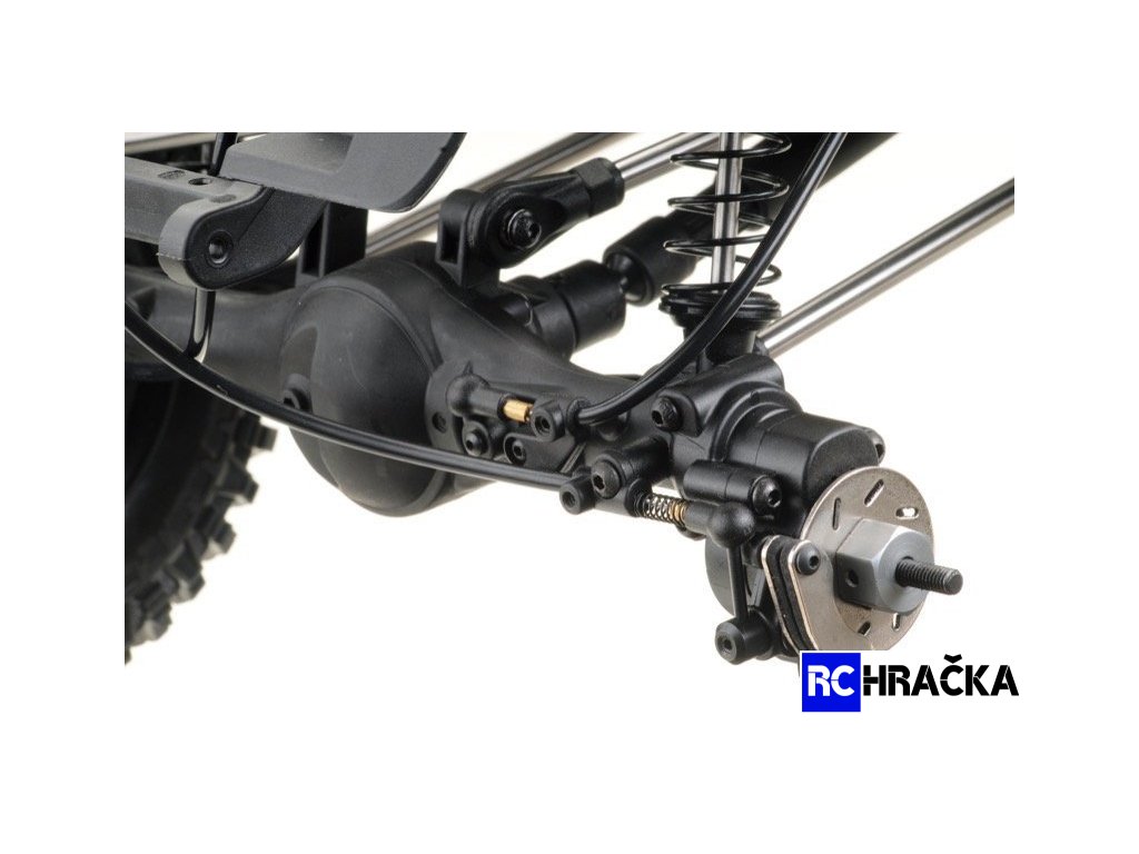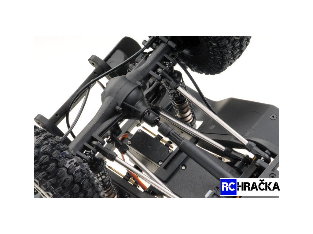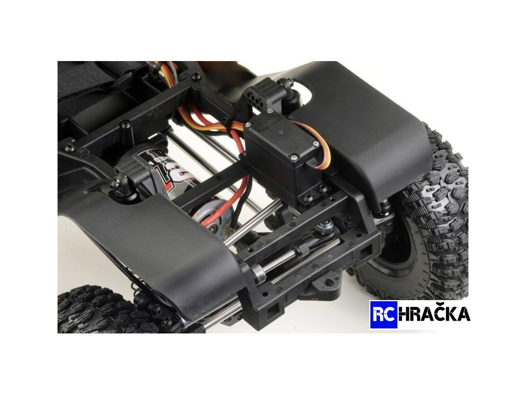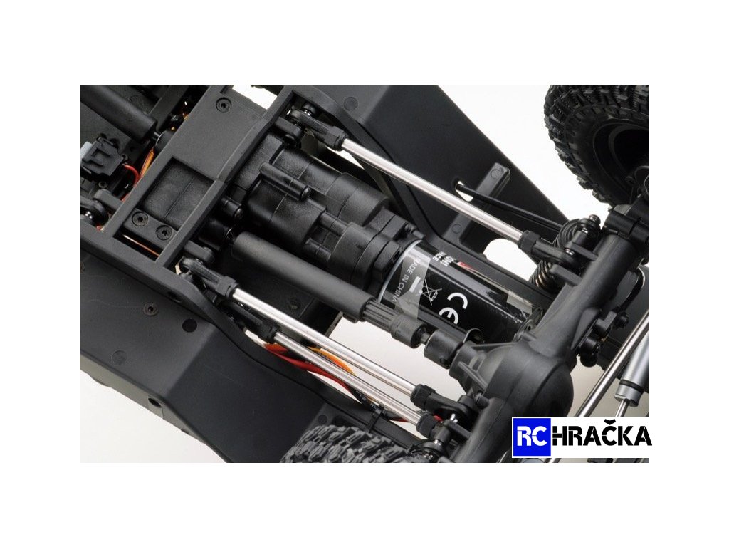 Nová generace expedičního speciálu Absima 1:10 s excelentními jízdními vlastnostmi. Model má pohon všech kol, je vybaven portálovými nápravami pro maximální průjezdnost terénem. Podvozek má díky novému umístění motru, převodovky a baterie velmi nízké těžiště, což výrazným způsobem vylepšuje jízdní vlastnosti. Dvoustupňová převodovka, uzávěrky diferenciálů, nainstalované LED osvětlení - vše je ovládané z jedenáctikanálového vysílače a ještě vám zůstanou volné kanály na ovládání případných dalších funkcí (naviják, majáky a pod.). Pevný plastový rám s rozvorem 325mm je vybaven plastovými podběhy, které výrazně omezují pronikání nečistot na šasi. Nápravy jsou zavěšené na klasickém 4-linku (kovové linky). Poloosy jsou vybaveny CVD klouby, přední kola mají úhel zatočení 45° na každou stranu. Měkké pneumatiky s velkým gripem jsou nalepené na 2.2 plastových diskách. Tlumiče jsou olejové, kovové. Všechny převody jsou kovové (kromě velkého převodového kola u pastorku) a komplet zakrytované. Pastorek s převodovým kolem mají modul 32dp. Silné servo řízení s tahem 25kg s kovovými převody ovládá přední kola přes účinný tlumič řízení, toto řešení výrazně prodlužuje životnost serva a snižuje nároky na jeho výkon (tah). Elektromotor je stejnosměrný typ 550 s velkým točivým momentem. Regulátor je integrovaný v přijímači, možné zatížení je až 60A, výkonný BEC 5A. Konektor na regulátoru je D-Dean. Karosérie je vybavena mnoha maketovými doplňky. Specialitou tohoto modelu je funkce DIG, která při zatáčení v náročném terénu může mechanicky uzavírat/brzdit zadní nápravu a tím výrazně zmenšovat poloměr zatáčení. Na rozdíl od běžných systémů DIG zde nebrzdí obě zadní kola, ale pouze jedno ve vnitřku zatáčky a tím dokáže ještě více snížit poloměr zatáčení a zvýšit manévrovací schopnosti modelu na omezeném prostoru.