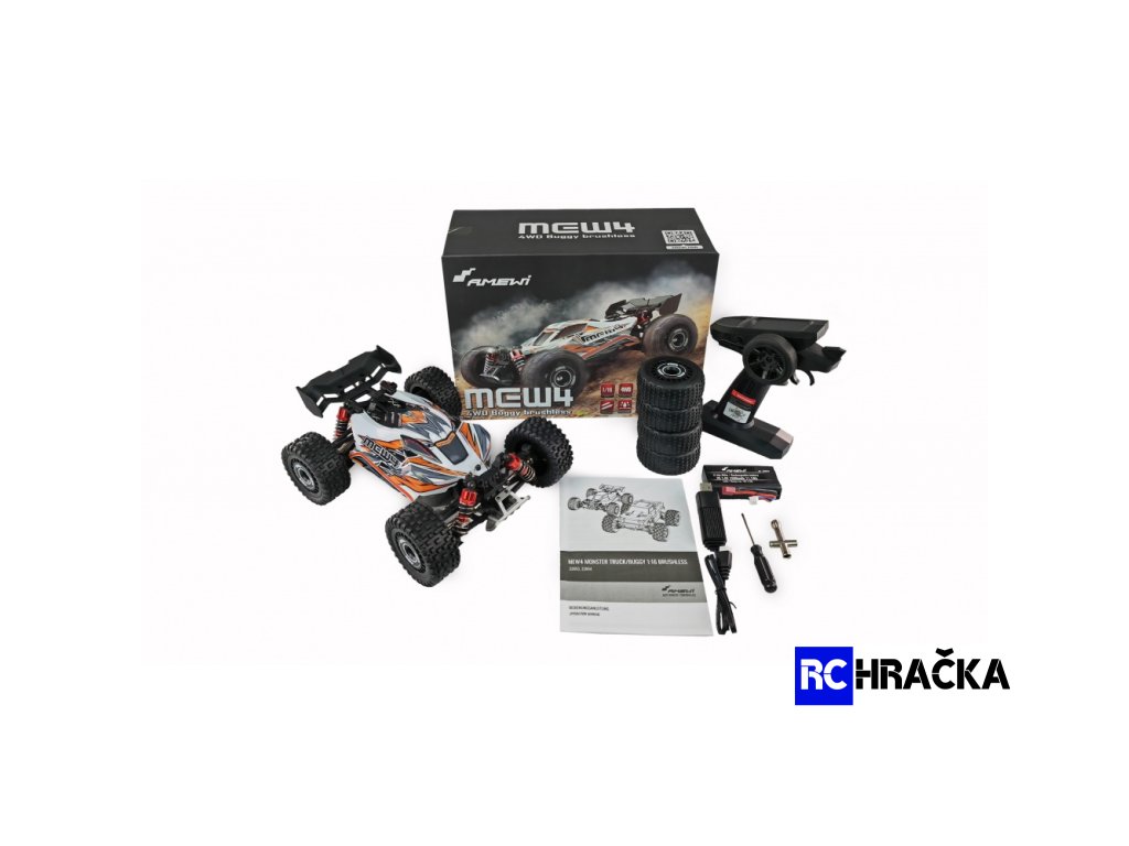 MEW4 Buggy je dodávána jako sada RTR (Ready-To-Run), což znamená, že je připravena k jízdě ihned po vybalení. Součástí balení je i dálkové ovládání 2,4 GHz, které nabízí intuitivní ovládání a možnost předvolby otáček (75/100 %) pro přizpůsobení jízdního zážitku vašim potřebám.