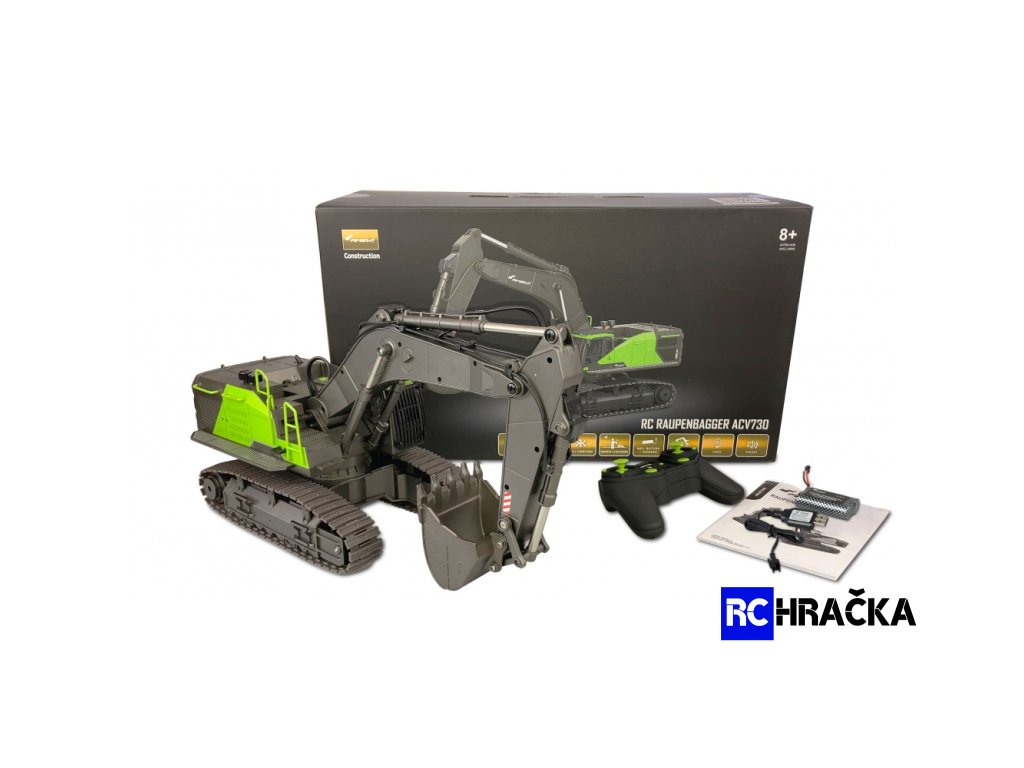 Perfektním poměrem cena/výkon se vyznačuje bagr AMEWI ACV 1:14, v netradiční zelené a antracitové barvě, díky které Vás zaujme hned na první pohled. Hlavní předností tohoto modelu je především plně proporcionální jízda a možnost plně plynulého ovládání všech funkcí bagru. To v reálu znamená, že můžete bagrem zároveň jet a při tom můžete i ovládat rameno a lžíci bagru. Nespornou výhodou a náskokem před konkurencí jsou kompletně kovové převody, kovová hnací kola pásů a hlavně kovové hnací šroubovice, díky kterým má bagr při "práci" několikanásobně větší sílu než konkurenční modely ve stejné cenové hladině. V neposlední řadě to je také kovová lžíce. Vysílač pracuje na 2,4 GHz, a může tedy společně pracovat neomezený počet bagrů, či dalších strojů, díky tomu, že je signál nenarušitelný, protože se model s vysílačem spáruje a komunikuje pod unikátním kódem. Ovládačem můžete ovládat všech 22 funkcí bagru, včetně LED osvětlení a zvukového režimu. Ve výbavě jsou také speciální gumové pásy, díky kterým má bagr bezkonkurenční přilnavost na jakémkoliv povrchu. Věž bagru se otáčí o 660 stupňů, velké a malé rameno mohou být ovládány nezávisle a lžíce bagru může kopat a vysýpat materiál. Tento bagr je skvělým mezistupněm mezi hračkami za pár korun a celokovovými profi bagry za poměrně dost peněz. AMEWI ACV PROFI 1:14 je skutečným pomocníkem a pracantem na každé stavbě a je určený pro kopání výkopů a přesun zeminy.
