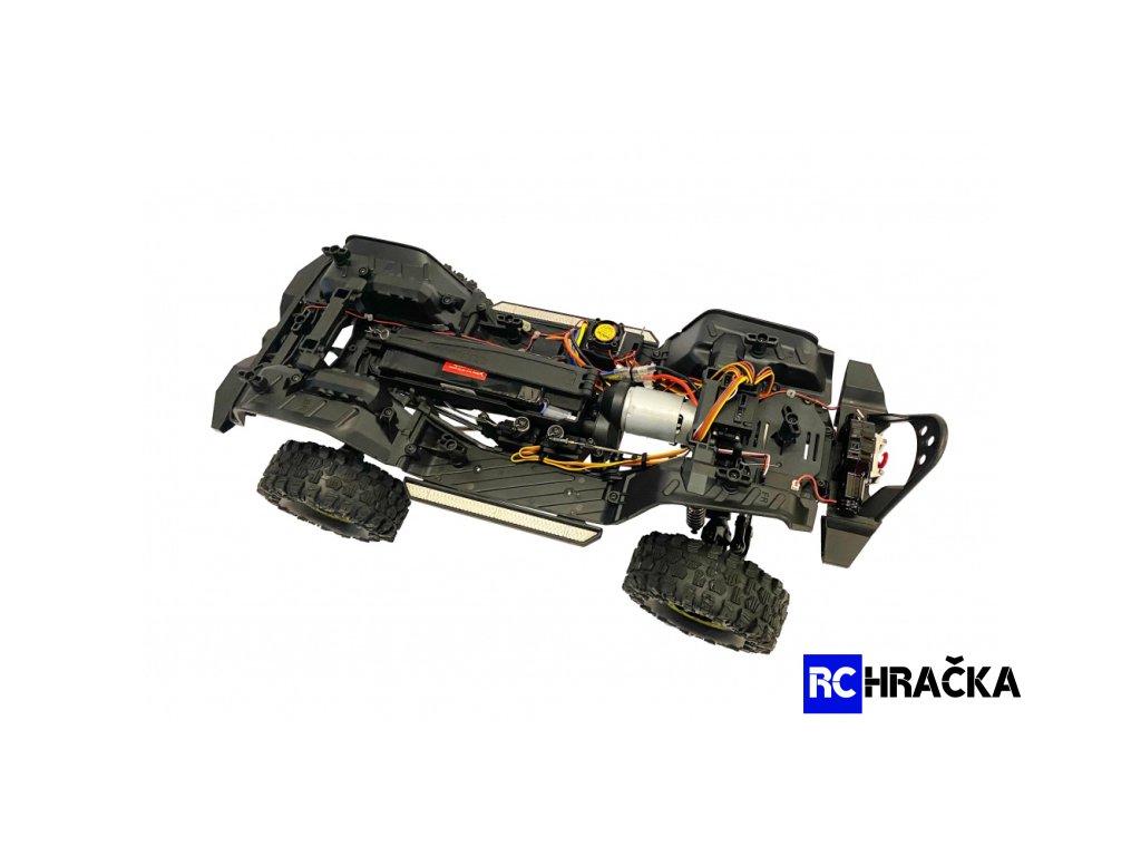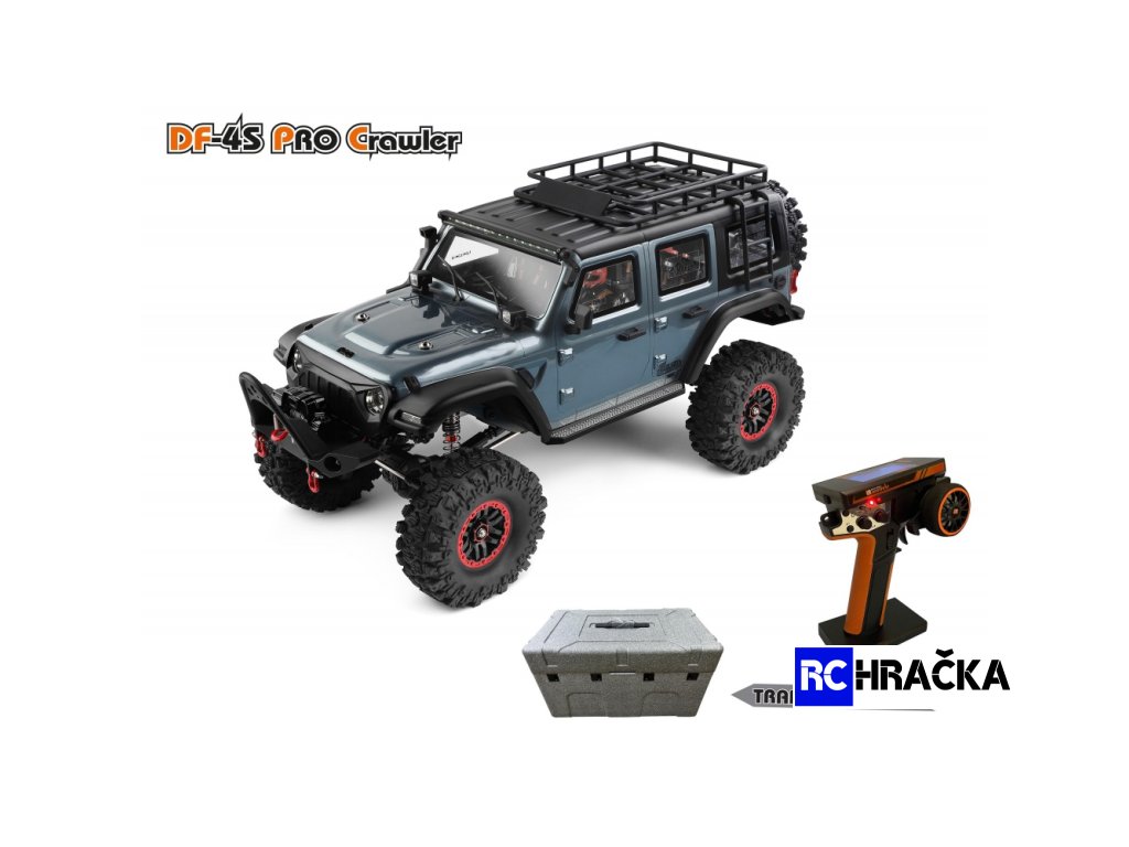 DF-4S PRO Crawler od DF Models je špičkový crawler nejvyšší třídy s rozvorem 313 mm. Podvozek s ocelovým rámem je ukryt pod krásnou karoserií s mnoha detaily a interiérem s figurkou řidiče. Karoserie je k podvozku připevněna neodimovými magnety a snadno se odklopí dozadu. Kovové vzpěry a tyče řízení zajišťují potřebnou stabilitu. Vertikálně uložené celohliníkové olejové tlakové tlumiče poskytují perfektní výkon v jakémkoli terénu. Řaditelná 2stupňová převodovka umožňuje pomalou jízdu terénem (cca 3 km/h) a po přeřazení na druhý rychlostní stupeň pomocí vysílače svižnou jízdu (cca 13 km/h). Elektromotor řady 550 může být napájen 7,4 V LiPo baterií (ta není součástí dodávky), což umožňuje extrémně dlouhou dobu jízdy. Díky univerzálnímu držáku baterie lze použít téměř jakýkoli typ 2S LiPo baterie. Tělo váhy je vybaveno LED osvětlením (světelná lišta, světlomety, couvací světlo, brzdové světlo, blinkry). Elektrický naviják s ocelovým lankem lze ovládat dálkovým ovladačem. To jsou pouze standardní funkce DF-4S PRO Crawler ... Tento model ale přichází s mnoha dalšími funkcemi! Diferenciály modelu lze různě zamykat nebo odemykat dálkovým ovládáním (oba odemknuté, oba zamčené, pouze přední zamčený a zadní odemčený). Náhon na kola je navíc redukován převodovkou a umožňuje tak dokonalý výkon. Portálové (zvýšené) nápravy mají navíc efekt, že model má větší světlou výšku a nezachycuje se na překážky, jak je běžné u standardních náprav. Dálkové ovládání je další předností. Díky modře podsvícenému LCD displeji lze sledovat stav baterií vysílače, sílu přenosu vysílače, který rychlostní stupeň (nízký nebo vysoký) je zařazen, úhel řízení v %, poloha plynu v %, stav trimu. Volant má přídavnou páku, pomocí které je možné „ovládání jednou rukou“. DF-4S PRO je dodáván v odolném přepravním boxu se zámky a madlem.