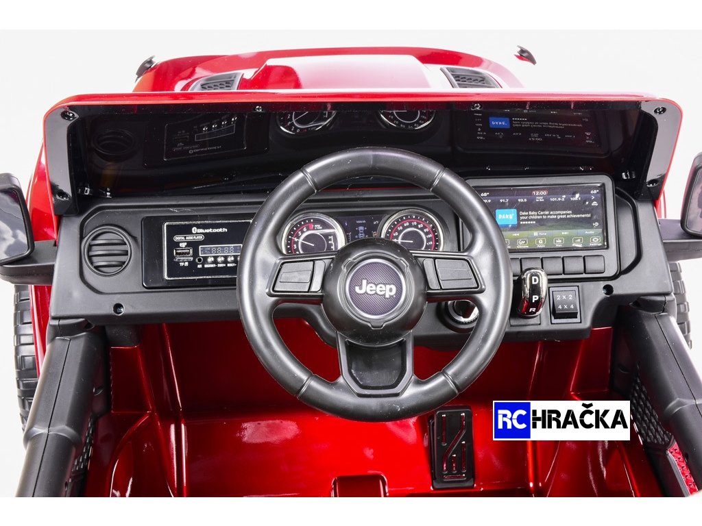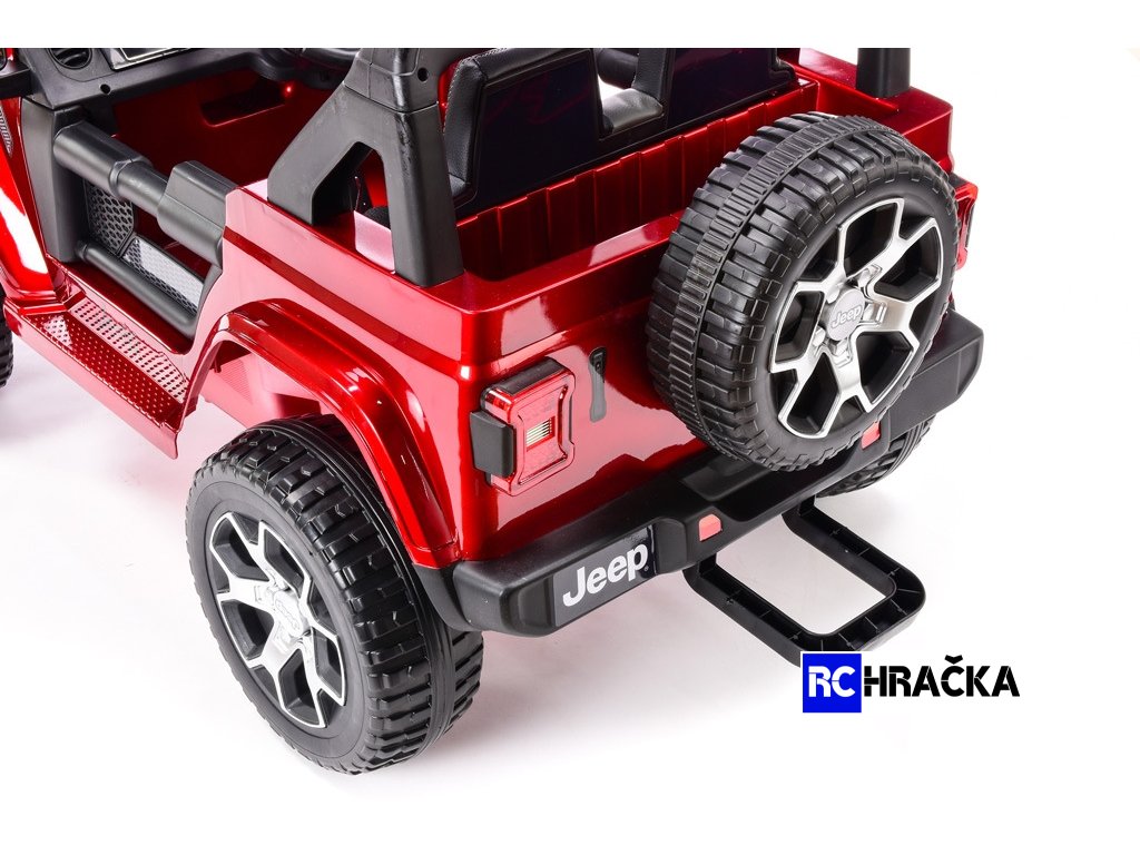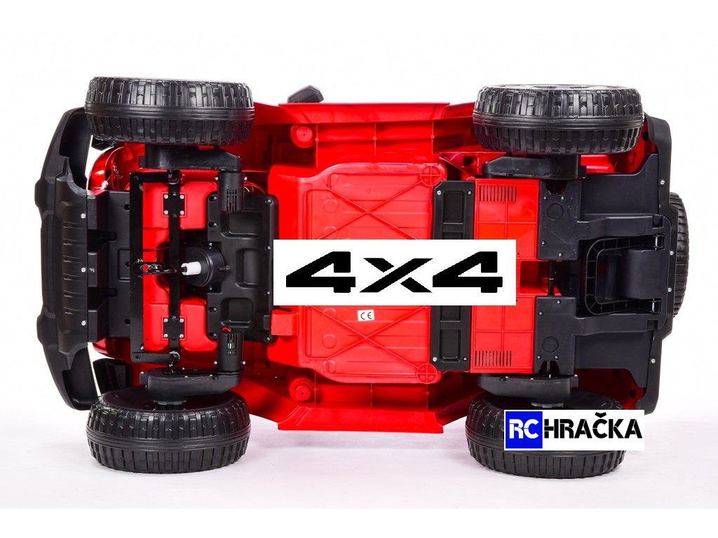 Dětské elektrické autíčko Jeep Wrangler Rubicon 4x4 v červené barvě má věrohodný vzhled originálního modelu, kvalitní materiály a zpracování. Otevírací dveře včetně kapoty a úložný prostor za sedačkou. Džíp je možné ovládat přes 2.4G dálkové ovládání, které má vždy přednost před řízením dítěte - tzn. džíp můžete kdykoliv okamžitě zastavit nebo přes pedál umístěný v autíčku. Při jízdě na pedál je možné volit směr vpřed či vzad. Při použití DO jsou pak na výběr 3 rychlosti jízdy. Při nesešlápnutém pedálu tah motorů nahrazuje brzdu nebo brzdíte tlačítkem na DO.
