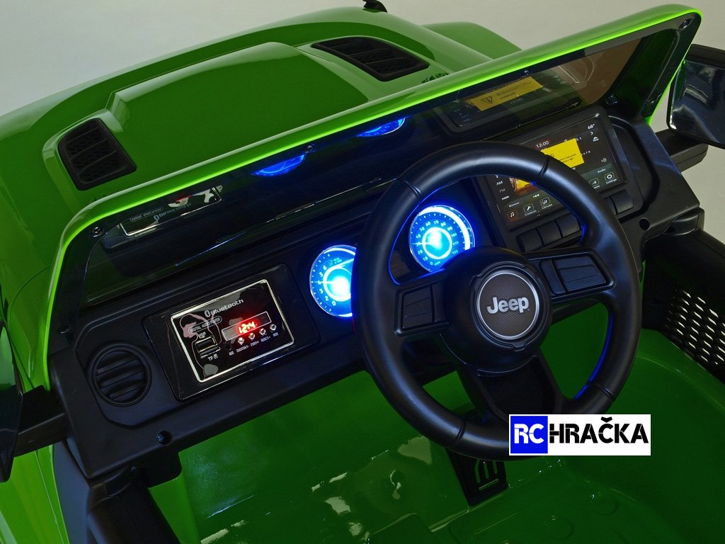Ve výbavě džipu naleznete vlastní klíčky, audioplayer s FM rádiem, či vstupy pro USB, SD nebo AUX. Dále má Wrangler voltmetr a zvukové efekty jako klakson, start motorů a muziku. Jeep má osvětlenou přístrojovou desku, 2 světla rampy, přední a zadní LED světla s možností vypnutí. Džíp pohání 4 výkonné elektromotory u každého EVA kola s možností vypnutí pohonu přední nápravy, což šetří baterii. O pohodlí dítěte se kromě zmíněných EVA kol postará i pohodlná čalouněná sedačka s bezpečnostním pásem a odpružená zadní náprava. Džíp má výsuvné madlo pro ruční tažení.