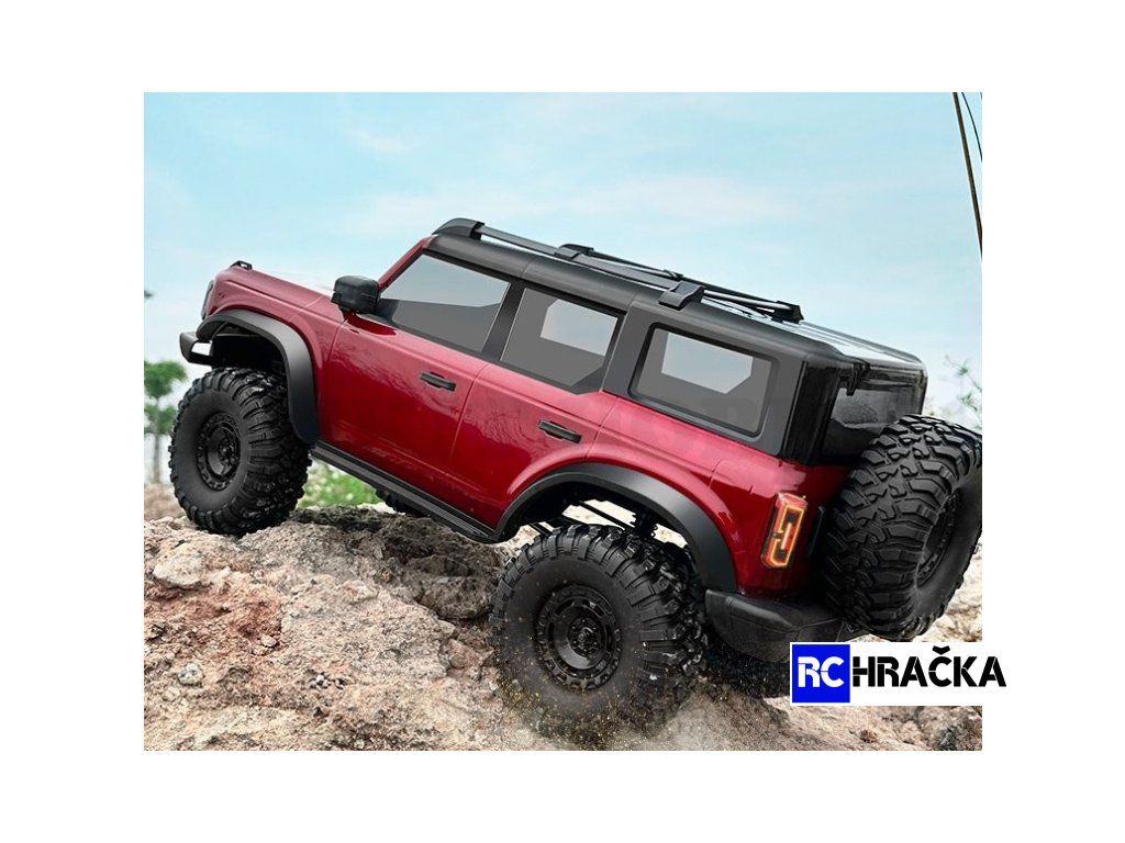RC Trail Crawler Nádherný, extrémně kvalitní a silný crawler pro náročnou jízdu terénem. Trail crawler je designován podle luxusního vozu Ford Bronco v měřítku 1/10. Je vyroben z odolného, kvalitního plastu, karoserie je třpytivé matné metalíze. Na první pohled je tohle RC auto nezapomenutelné. Jízda s ním je opravdový zážitek. Terénní RC auto Tento RC model je sestrojen tak, aby obstál při jízdě v náročném terénu. To mu umožňuje silný stejnosměrný motor 550, pohon všech 4 kol, která jsou usazena na kovových převodech. To způsobuje hladký chod celého RC auta. Táhla řízení, spojovací tyče a hřídele jsou kovové, nezávislé kovové tlumiče poskytují stabilitu a kovová převodovka je uzavřená v prachotěsném obalu. Celý podvozek je vyroben z pevného kvalitního plastu, model váží 5,1 kg. Pneumatiky jsou vyrobeny z ultra měkké gumy, jejich průměr je 12 cm, což způsobuje skvělou trakci a jízdní vlastnosti v náročném terénu. Model dokáže stoupat až pod 45° úhlem. 2 rychlostní režimy RC Trail Crawler je sice uzpůsoben ke zdolávání výzev v terénu, ale zároveň je jeho maximální rychlost 18 km/h. K dispozici jsou 2 rychlostní režimy, mezi kterými můžete jednoduše přepínat na dálkovém ovládání. Pomalejší režim využijete při expediční jízdě a když budete mít chuť si jen tak zajezdit či zazávodit, využijete rychlejší režim. Je to nádherné RC auto, které je vhodné jak pro děti, tak pro dospělé, pro začátečníky i pokročilé, prostě pro všechny, kdo hledají krásu, sílu a odolnost. Světla a akumulátor Celý design jen dokreslují detaily, jsou jsou sklopná zrcátka, přední nárazník, na zadních dveřích 5 kolo atd. Naprosto jedinečná, plně funkční, přední i zadní světla, blinkry, brzdová a couvací světla taktéž ovladatelná pomocí dálkového ovládání. Ovladač je pistolový, funguje na frekvenci 2.4 Ghz, jeho dosah je cca 100m. Potřebujete do něj 4 x AA baterie. Lze na něm seřídit zatáčení i řízení. Samozřejmostí je plně proporcionální ovládání. Vpřed ho žene akumulátor Li-ion 7,4 V 3000 mAh, který nabijete přiloženou USB nabíječkou za cca 5 hodin. Doba jízdy je závislá na stylu jízdy.