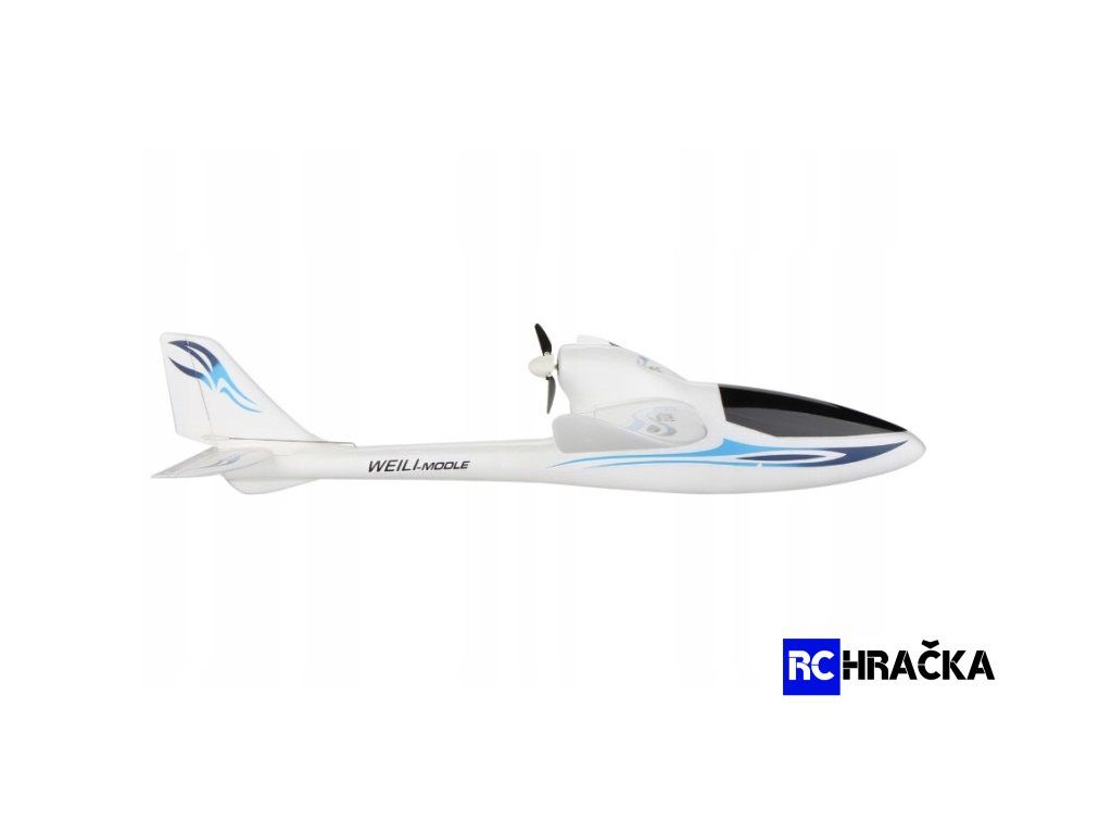 Tlačná vrtule se při vypnutém plynu sklopí a můžete s RC modelem lehce plachtit vzduchem. Balení obsahuje vše co potřebujete k letu, chybí jen tužkové AA baterie do ovladače.