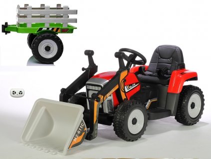 Dětský elektrický farmářský traktor s vlekem a lopatou v červené barvě, 2,4G Bluetooth DO s přednostní jízdou, plynulým rozjezdem, MP3, USB, FM rádiem, voltmetrem, EVA...